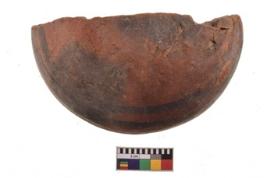| Description / विवरण | Specimen of black on red ware with decorative geometric parallel lines painting. |