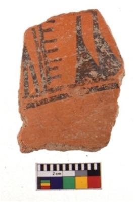 | Description / विवरण | A specimen of a potsherd. It is reddish in colour with black decorative geometric painting on it. |