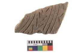 | Description / विवरण | A fragment of a potsherd. It is reddish in colour with engraved decorative geometric painting on it. |