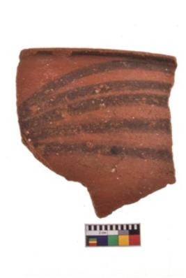 | Description / विवरण | Specimen of black on red ware with decorative geometric Its decorated with two horizontal bands sets of triple arches painting. |