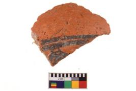 | Description / विवरण | A specimen of a potsherd. It is reddish in colour with black decorative geometric painting on it. |