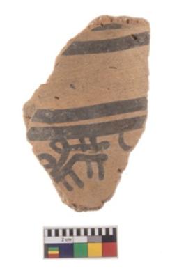 | Description / विवरण | A fragment of a potsherd. It is reddish in colour with black decorative geometric painting on it. |