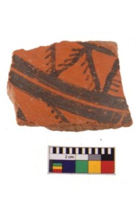 | Description / विवरण | A specimen of a potsherd. It is reddish in colour with black decorative geometric painting on it. |