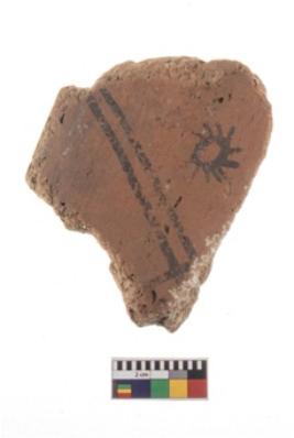 | Description / विवरण | A fragment of a potsherd. It is reddish in colour with black decorative nature painting on it. |