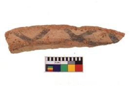 | Description / विवरण | A specimen of a potsherd. It is reddish in colour with black decorative geometric painting on it. |