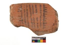 | Description / विवरण | A specimen of a potsherd. It is reddish in colour with black decorative geometric painting on it. |