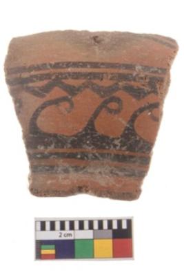 | Description / विवरण | A fragment of a potsherd. It is reddish in colour with black decorative geometric painting on it. |