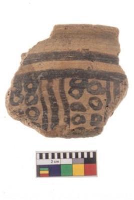 | Description / विवरण | A fragment of a potsherd. It is reddish in colour with black decorative geometric painting on it. |