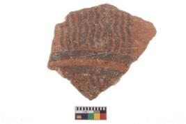 | Description / विवरण | A fragment of a potsherd. It is reddish in colour with black decorative geometric painting on it. |