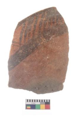 | Description / विवरण | Specimen of potsherd with black decorative geometric painting . |