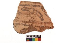 | Description / विवरण | A specimen of a potsherd. It is reddish in colour with black decorative geometric painting on it. |