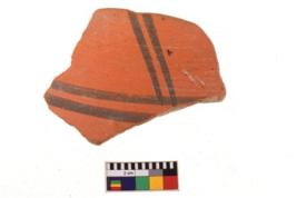 | Description / विवरण | A specimen of a potsherd. It is reddish in colour with black decorative geometric painting on it. |