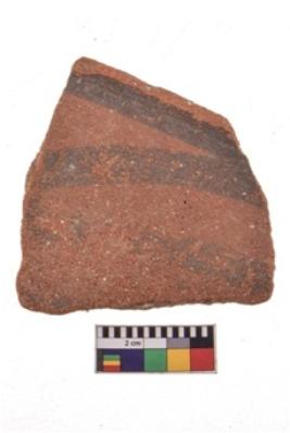 | Description / विवरण | Specimen of black on red ware with decorative geometric Its decorated with two horizontal bands with sets of triple arches painting. |