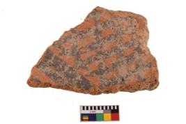 | Description / विवरण | A specimen of a potsherd. It is reddish in colour with black decorative geometric painting on it. |