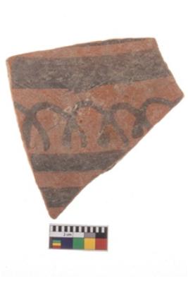 | Description / विवरण | A fragment of a potsherd. It is reddish in colour with black decorative geometric painting on it. |