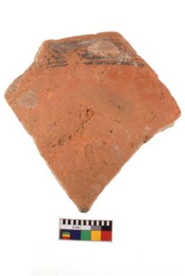 | Description / विवरण | A specimen of a potsherd. It is reddish in colour with black decorative geometric painting on it. |
