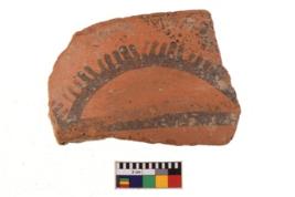 | Description / विवरण | A specimen of a potsherd. It is reddish in colour with black decorative geometric painting on it. |