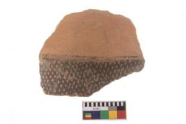 | Description / विवरण | A fragment of a potsherd. It is reddish in colour with black decorative geometric painting on it. |