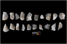 | Description / विवरण | Specimen of flake tools with prominent flaking marks. They are made up of a short flakes with sides trimmed. Some of them are rectangular flakes with wavy thick distal end and broken functional top. |