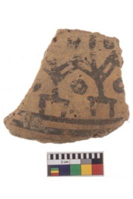 | Description / विवरण | A fragment of a potsherd. It is reddish in colour with black decorative geometric painting on it. |