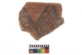 | Description / विवरण | A fragment of a potsherd. It is reddish in colour with black decorative geometric painting on it. |