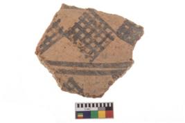 | Description / विवरण | A fragment of a potsherd. It is reddish in colour with black decorative geometric painting on it. |