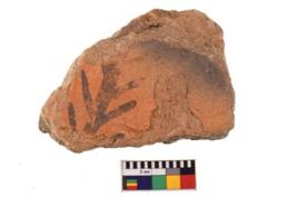 | Description / विवरण | A specimen of a potsherd. It is reddish in colour with black decorative nature painting on it. |