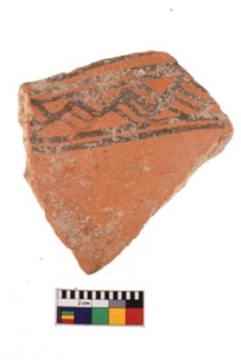 | Description / विवरण | A specimen of a potsherd. It is reddish in colour with black decorative geometric painting on it. |