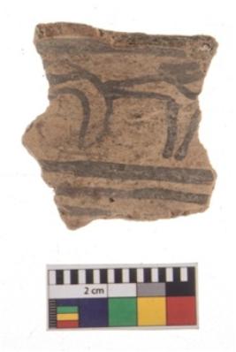 | Description / विवरण | A fragment of a potsherd. It is reddish in colour with black decorative animal painting on it. |