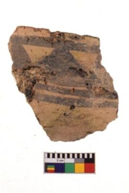 | Description / विवरण | A specimen of a potsherd. It is reddish in colour with black decorative geometric painting on it. |