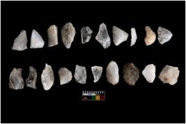 | Description / विवरण | Specimen of flake tools with prominent flaking marks. They are made up of a short flakes with sides trimmed. Some of them are rectangular flakes with wavy thick distal end and broken functional top. |