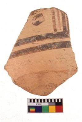 | Description / विवरण | A specimen of a potsherd. It is reddish in colour with black decorative geometric painting on it. |