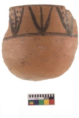 | Description / विवरण | A fragment of a potsherd. It is reddish in colour with black decorative geometric painting on it. |