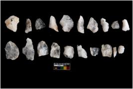 | Description / विवरण | Specimen of flake tools with prominent flaking marks. They are made up of a short flakes with sides trimmed. Some of them are rectangular flakes with wavy thick distal end and broken functional top. |