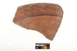 | Description / विवरण | A specimen of a potsherd. It is reddish in colour with black decorative geometric painting on it. |
