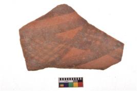 | Description / विवरण | Specimen of black on red ware with decorative geometric A row latticed diamonds set in horizontal bands but having groups of oblique lines at intervals painting. |