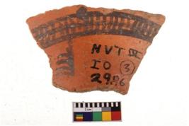 | Description / विवरण | A specimen of a potsherd. It is reddish in colour with black decorative geometric painting on it. |