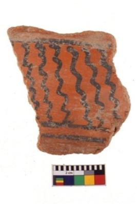 | Description / विवरण | A specimen of a potsherd. It is reddish in colour with black decorative geometric painting on it. |