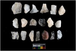 | Description / विवरण | Specimen of flake tools with prominent flaking marks. They are made up of a short flakes with sides trimmed. Some of them are rectangular flakes with wavy thick distal end and broken functional top. |