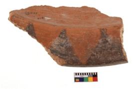 | Description / विवरण | A specimen of a potsherd. It is reddish in colour with black decorative geometric painting on it. |