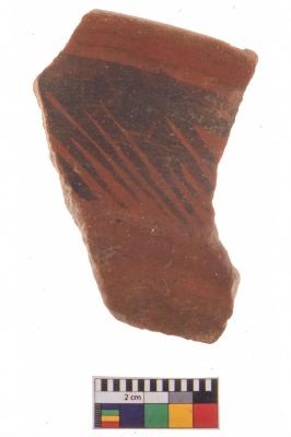 | Description / विवरण | Specimen of potsherd with decorative geometric Linear painting, Type Black on Red Ware . |
