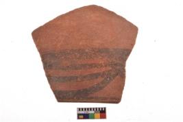 | Description / विवरण | Specimen of black on red ware with decorative geometric Its decorated with two horizontal bands with sets of triple arches painting. |