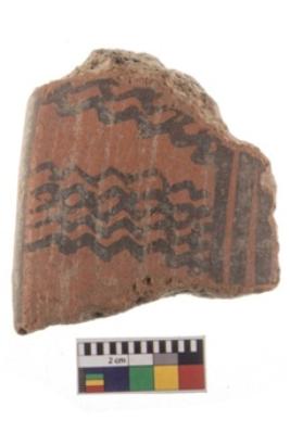 | Description / विवरण | A fragment of a potsherd. It is reddish in colour with black decorative geometric painting on it. |