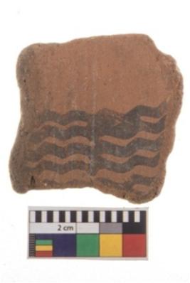 | Description / विवरण | A fragment of a potsherd. It is reddish in colour with black decorative geometric painting on it. |