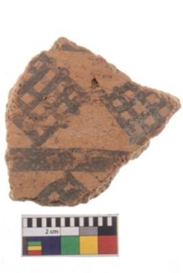 | Description / विवरण | A fragment of a potsherd. It is reddish in colour with black decorative geometric painting on it. |