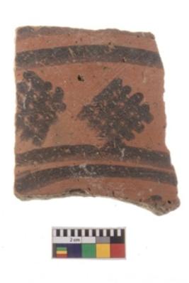 | Description / विवरण | A fragment of a potsherd. It is reddish in colour with black decorative geometric painting on it. |