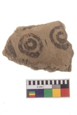 | Description / विवरण | A fragment of a potsherd. It is reddish in colour with black decorative geometric painting on it. |