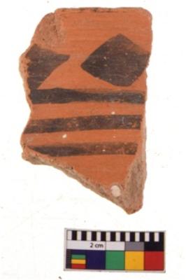 | Description / विवरण | A specimen of a potsherd. It is reddish in colour with black decorative geometric painting on it. |