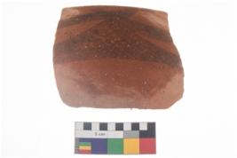 | Description / विवरण | Specimen of potsherd with black decorative geometric diamond set broad horizontal bands painting . |