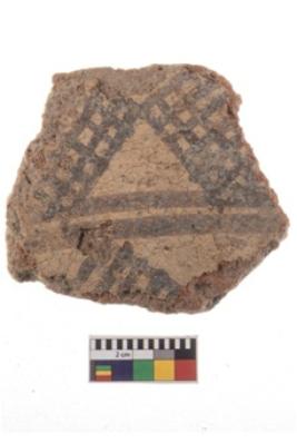 | Description / विवरण | A fragment of a potsherd. It is reddish in colour with black decorative geometric painting on it. |